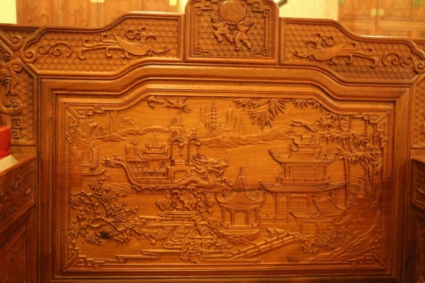 接下來,我們來看看沙發背靠板正面的主體部分,其畫案外部輪廓形狀呈現如一墨水瓶式形狀設計,上端較為扁實。內部雕刻圖案展現得極為豐富艷麗,正如該款沙發名字所闡述的那樣——“漢宮春曉”,宛如一幅文人古畫卷中的景致,可以很清晰地看見:那波光漣漪的湖水載著亭臺綺立的龍舟,婉延而緩緩向前開來的景象,前段龍首處神情惟妙惟肖極為莊重而氣定神閑,畫案立于其主體的正中位置,顯得極為惹目和顯眼。在湖水岸邊,靠右端的湖岸上則是那茂密蔥郁的竹林,雖未能身處畫中,卻好似可以聽見,那一葉葉竹瓣隨著微風飄蕩,窸窣碎碎交相搖晃時所發出的聲響,頗顯幽靜而深遠。另在畫案后方的遠景處,除了稀疏而立的幾目草木郊野,還有一座頂天而豎的寶塔,遠遠眺望著,好似氣派風度。而在湖水的上方,還可以瞥見那兩只展翅高飛的仙鶴,它們乘風而列,自由翱翔時的自在景象,也為整體的畫卷添加了某種只有身處仙境神域時所能感受體會的到的意境神韻感受,另外仙鶴它也代表了長壽與富貴,它仙風道骨,為羽族之長,是為該幅富麗堂皇畫卷中的一處獨特景觀,妖嬈而鶴立。在整體圖案的其他位置,還雕繪有幾目莊嚴氣派矗于湖岸的亭臺樓倚,一尾身處龍舟后方悄悄而出的小帆舟,以及附著于畫卷中央下方位置處,飄縷浮動緩緩而延的祥云…