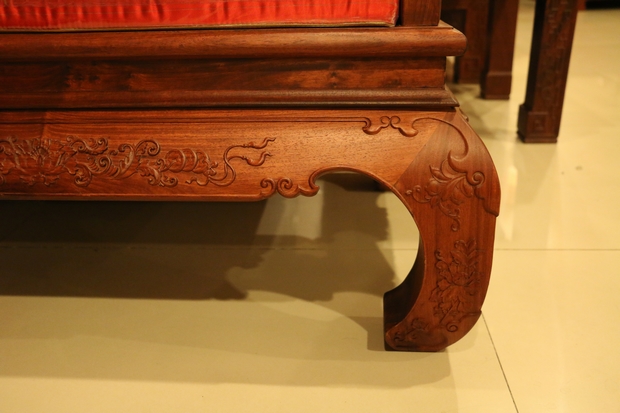 沙發(fā)的其他各處細節(jié)。其座椅面,平整略帶淡雅的原木光澤,顯得十分地古典清秀,清新而自然。沙發(fā)的四處椅角設計則比較有特色,非一般沙發(fā)筆直或稍顯圓潤的直線型豎直設計,其風格有些像動物的犄角,彎曲而延伸,安然優(yōu)雅而簇立,顯得地十分溫婉可掬,驚艷動人,就如同那華貴的牡丹,艷壓在那群芳之中,清新而脫俗。而椅座面下方與椅腳相連的幾段木橫處,同樣飾繪有牡丹的圖案紋飾,并且在其左右兩端各串有幾銜銅錢,隱含著“滾滾財源”“富貴吉祥”的寓意。