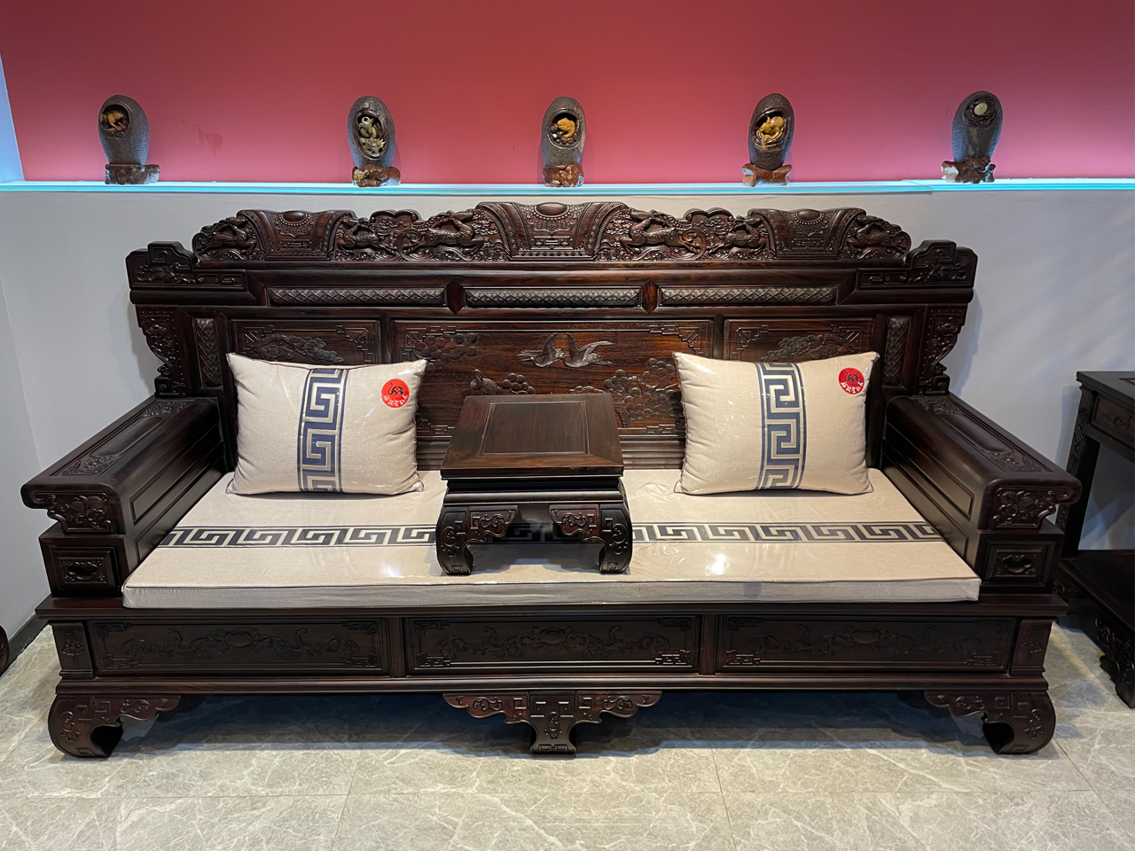 細賞家具巧奪天工的雕飾和花紋以及天衣無縫的卯榫結構,凝重不失風尚,張揚不失穩重,華麗不失深沉,不得不贊嘆中華文明之厚重,現代繼承發揚之精彩。
